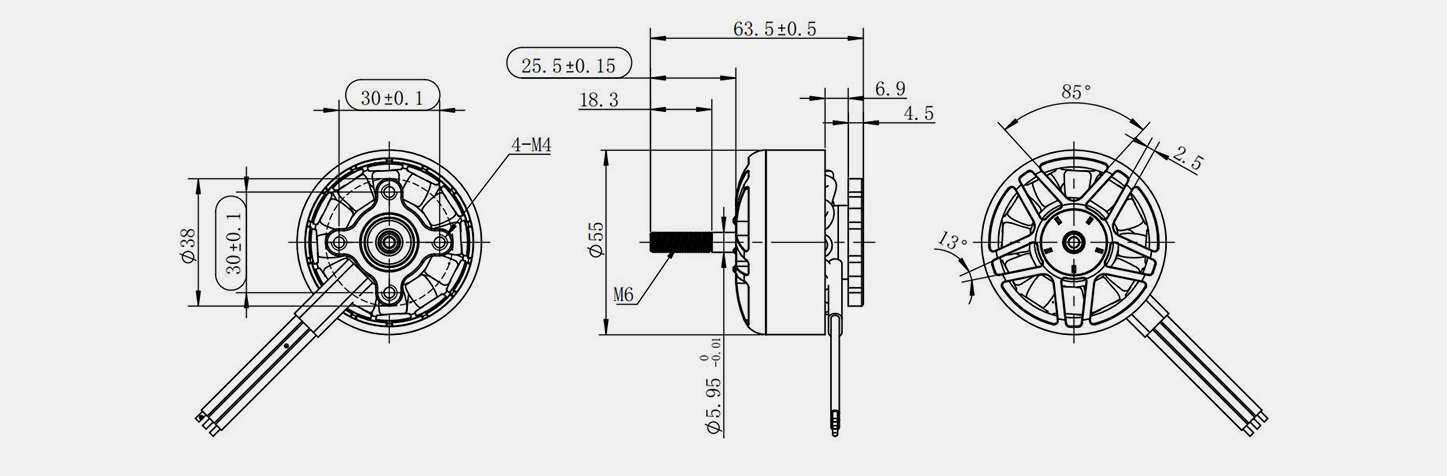 | Max. P (W) | Jännite (V) | Max. minä (A) | KV | Tyhjävirta (A) | Resistanssi (mΩ) | puolalaiset | Moottorin himm. (mm) | Staattorin himm. (mm) | Asennus (mm) | N.W. (g) | Prop. (tuumaa) | ||||||||||||||